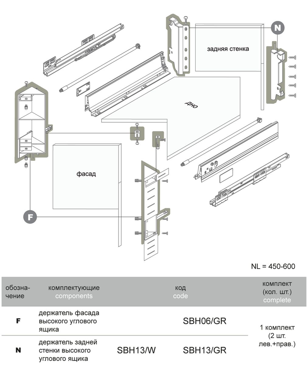 Держатель задней стенки высокого углового ящика предназначен для надежной фиксации задней стенки с боковинами углового ящика под минимально необходимый проем 224 мм. Необычная «ломаная» форма задней стенки, под прямым углом, требует выверенного крепежного решения. Поэтому для возможности формирования прочного углового ящика BOYARD предлагает специальный держатель, отвечающий всем требованиям формы задней стенки.