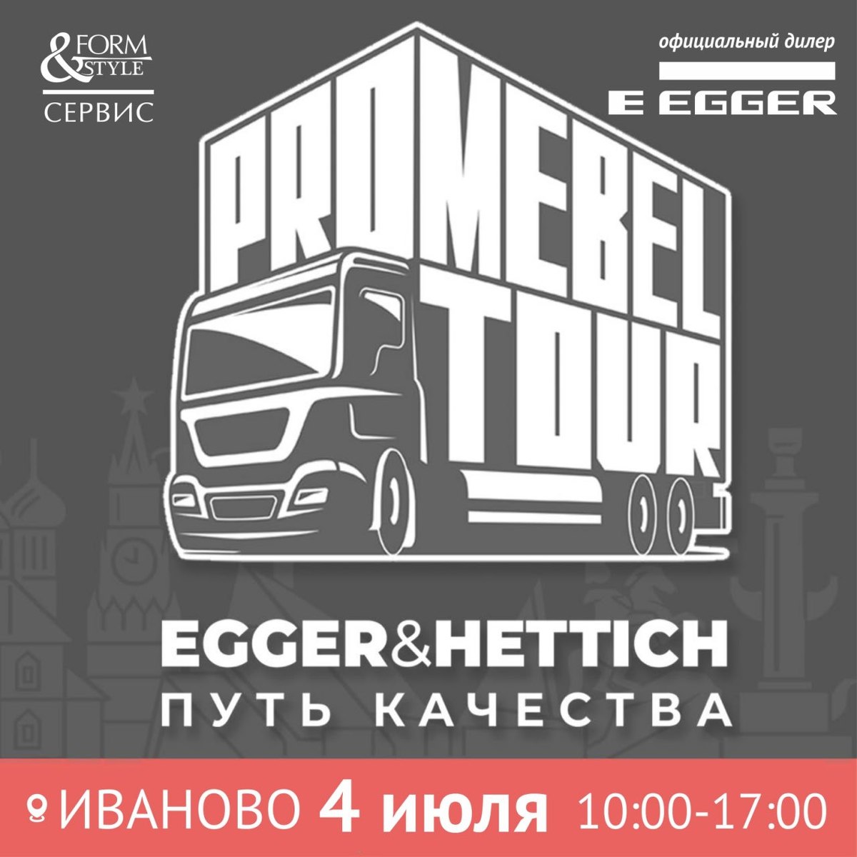 4 июля приходите и принимайте участие в ProMebelTour, где вы узнаете о последних трендах прямиком с мировых мебельных выставок, получите консультации у технических специалистов EGGER из первых уст, а также сможете увлекательно провести время, принимая участие в конкурсах с ценными и полезными призами.